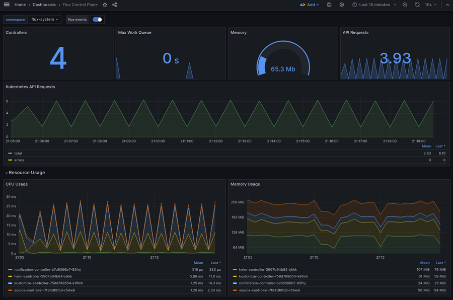 The Flux monitoring stack comes with two dashboards for easy visualization of Flux controllers and resource metrics. You can follow this link to learn how to set it up.