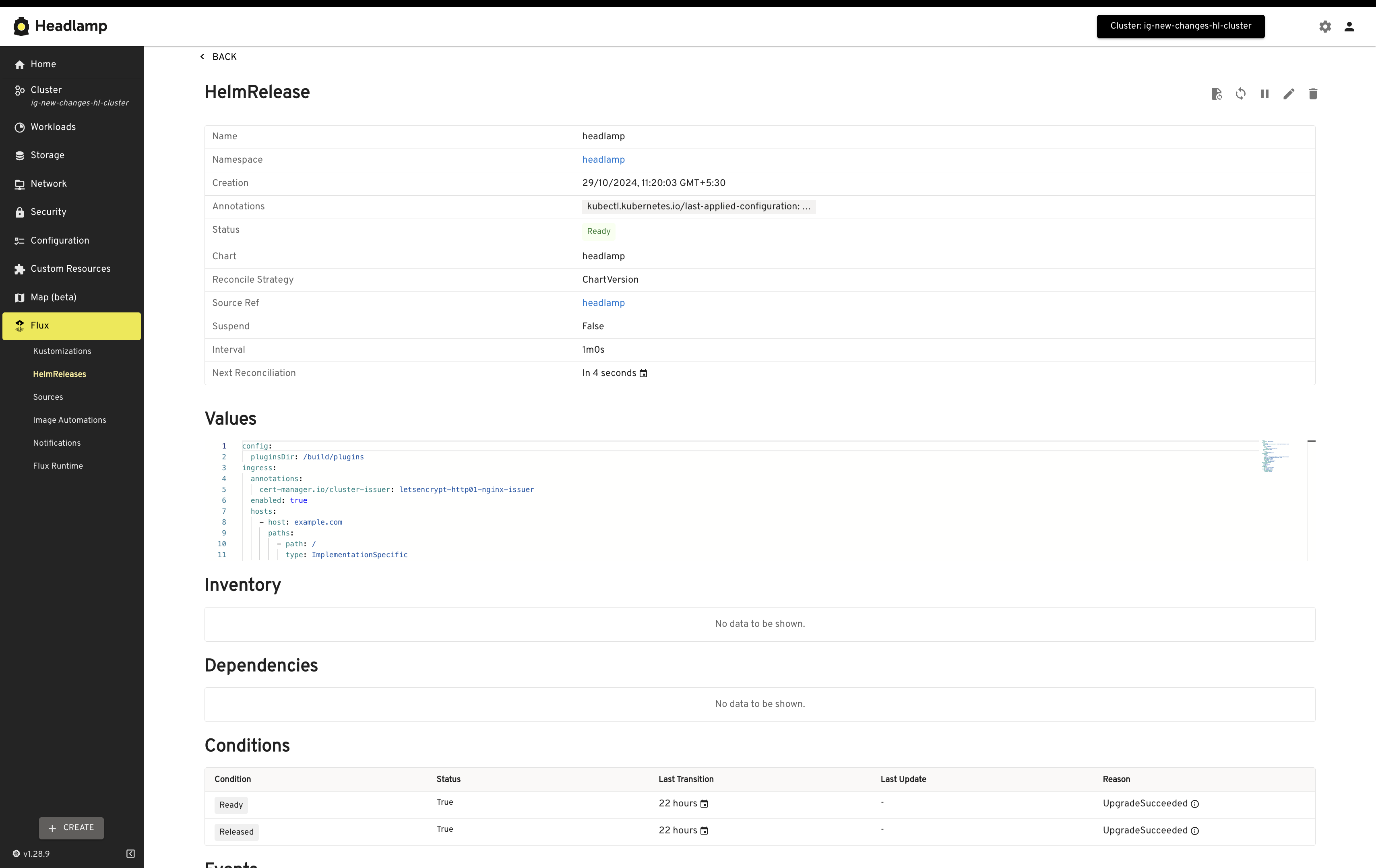 headlamp/flux-pluginHeadlamp is a Kubernetes UI extensible through plugins. The Flux plugin for Headlamp allows to visualize Flux and perform operations common operations like quick sync’ing, suspending/resuming, and others. See the plugin README for installation instructions.